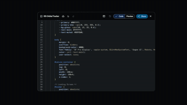 强大的推理能力还让Gemini 3.1 Pro打破了复杂API与人性化设计之间的壁垒。谷歌展示的一个例子里,模型直接构建出一个实时的航天数据看板,完美接入公开的遥测数据流,将国际空间站的实时运行轨迹清晰地展现在你眼前,将一堆冷冰冰的数据接口变成了普通人也能看懂的交互界面。