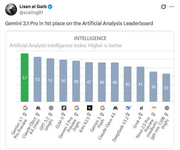 在Artificial Analysis的智能指数测试中,Gemini 3.1 Pro吊打对手