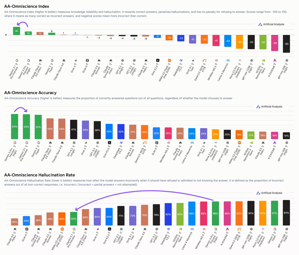 在AA-Omniscience测试中,Gemini 3.1 Pro幻觉率大幅下降