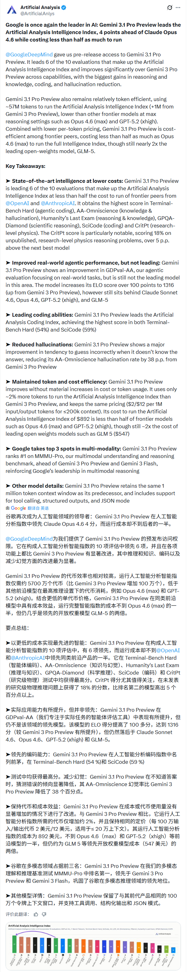 第三方机构Artificial Analysis的测试也显示,Gemini 3.1 Pro的综合智能指数已经悄悄爬到了第一,把Claude Opus 4.6甩在了身后。