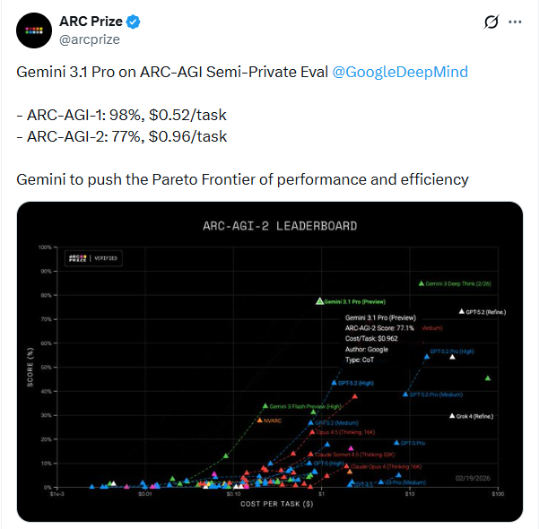 Gemini 3 Pro之前的得分是31.1%,而Gemini 3.1 Pro一口气冲到了77.1%。谷歌DeepMind的老板戴密斯·哈萨比斯(Demis Hassabis)也特地发文说,这标志着模型在核心推理和问题解决能力上有了重大改进。