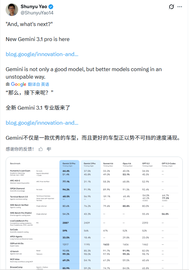 谷歌CEO桑达尔·皮查伊(Sundar Pichai)亲自下场,强调了这次在核心推理能力上的翻倍提升,并表示新模型非常适合处理那些“将创意项目变为现实”的复杂任务。