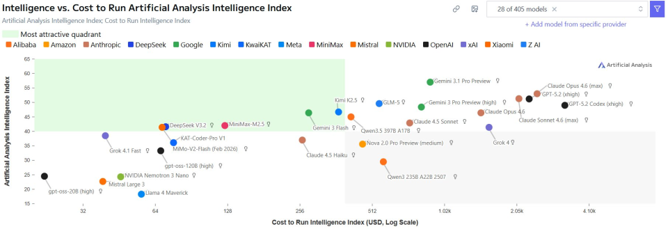 最让人意外的是定价。Gemini 3.1 Pro保持了和Gemini 3 Pro完全一样的价格:输入每百万tokens 2美元起,输出每百万tokens 12美元起。Artificial Analysis算了一笔账:跑完他们整个智能指数测试集,Gemini 3.1 Pro的花费还不到Claude Opus 4.6的一半。