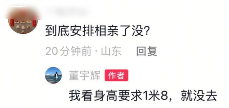 除此之外,春节期间,董宇辉也被网友问及是否被安排了相亲,面对这个问题,他用一贯的幽默回应:看身高要求 1 米 8 就没去。