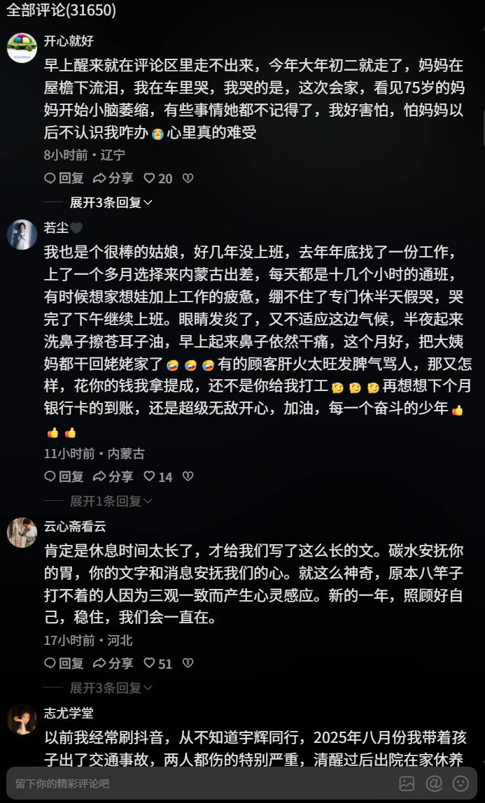 其实董宇辉这个春节假期能引发这么多讨论,就是因为他的状态太真实了,刚好戳中了咱们打工人的心。高强度工作后难得松口气、对家里人的牵挂、假期结束不想上班的纠结,这些事儿,咱们过年的时候几乎都经历过。