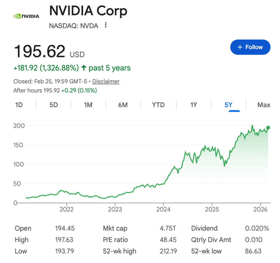 通过AI业务,英伟达展现出了极为恐怖的盈利能力,也被广大投资者认可。2025这一整年,英伟达的股价涨了34.8%。这个增速看起来不是很夸张,但2024年英伟达股价已经涨了171%,2023年更是涨了239%。现在,英伟达的市值已经逼近5万亿,超过了微软和苹果,是全球市值最高的企业。
