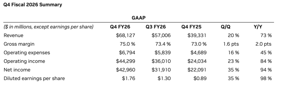 英伟达财年和日历年并不一致,2026财年Q4对应的实际月份为去年11月、12月和2026年1月。过去三个月,英伟达的营收达到了681.3亿美元,同比增长73%;净利润430亿美元,相比去年同期几乎翻倍。